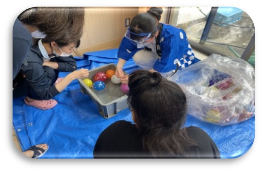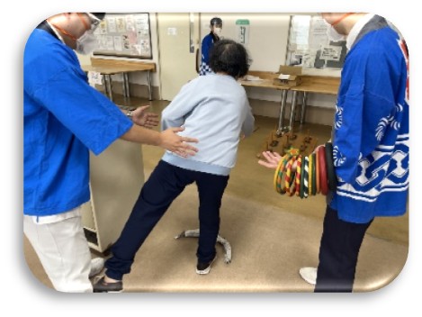 この夏も、8月に病棟内で夏祭りを開催しました。企画内容は「スイカ割り・ヨーヨー釣り・輪投げ・アイスの配布」です。スイカ割りで使うスイカは、4月頃から中庭で栽培を始めて準備していましたが、残念ながらうまく育ちませんでした。そこで、作業療法士と相談を重ね、手作りの工作スイカを用意し、何度も患者様に楽しんでいただける仕様に工夫しました。スイカが割れるたびに、笑顔や拍手が広がり、とても盛り上がりました。